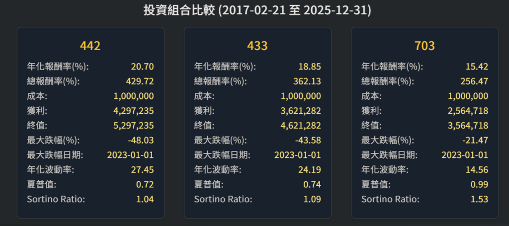 | 442 組合 | 40% : 40% : 20% | 1.2 | 積極攻勢。適合累積期,利用高 Beta 加速資產積累,需極強心理韌性。 | ~ 20.7% |